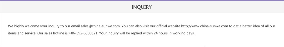 You can consult your trusted dealer for inquiry, you can also visit our official website: http://www.china-sunwe.com or call our sales hotline: + 86-592-6300621 for inquiry, We will reply your inquiry within 24 hours (excluding rest days).