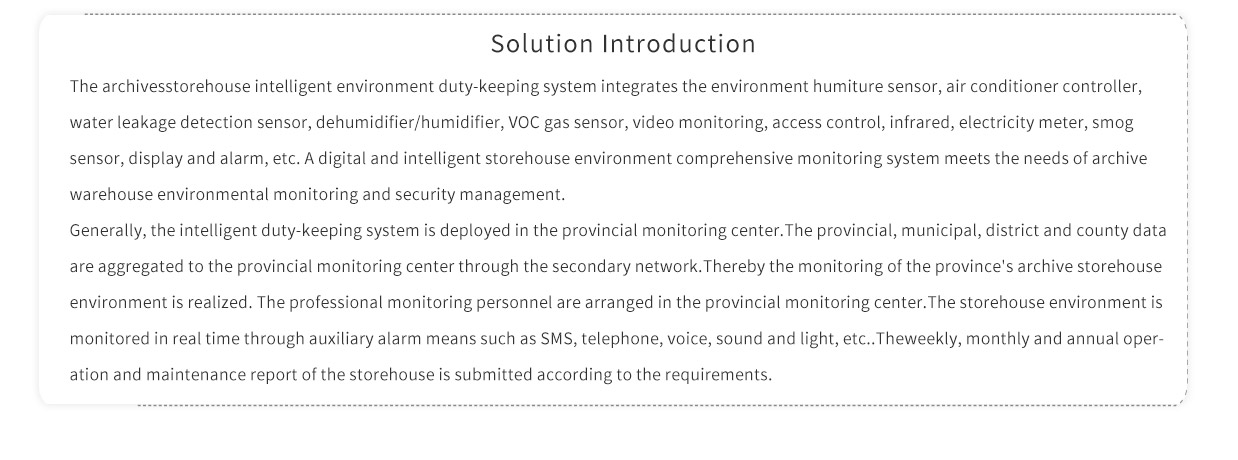 Generally, the intelligent duty-keeping system is deployed in the provincial monitoring center.The provincial, municipal, district and county data are aggregated to the provincial monitoring center through the secondary network.Thereby the monitoring of the province's archive storehouse environment is realized. The professional monitoring personnel are arranged in the provincial monitoring center.The storehouse environment is monitored in real time through auxiliary alarm means such as SMS, telephone, voice, sound and light, etc..Theweekly, monthly and annual operation and maintenance report of the storehouse is submitted according to the requirements.