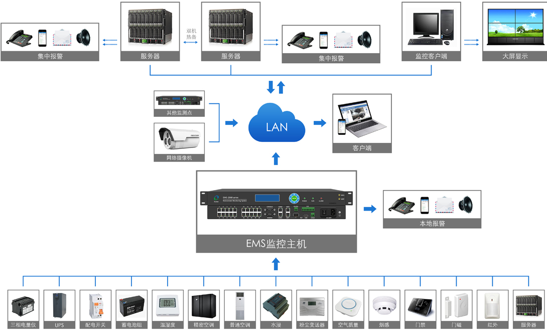 EMS系列监控主机主要用以采集数据、处理数据,可对环境、运行负载、设备温升、局放工况、安防、视频、消防、智能设 备等进行一体化监控。在实际应用中,与不同类型的传感器相连,布线简洁,操作方便。